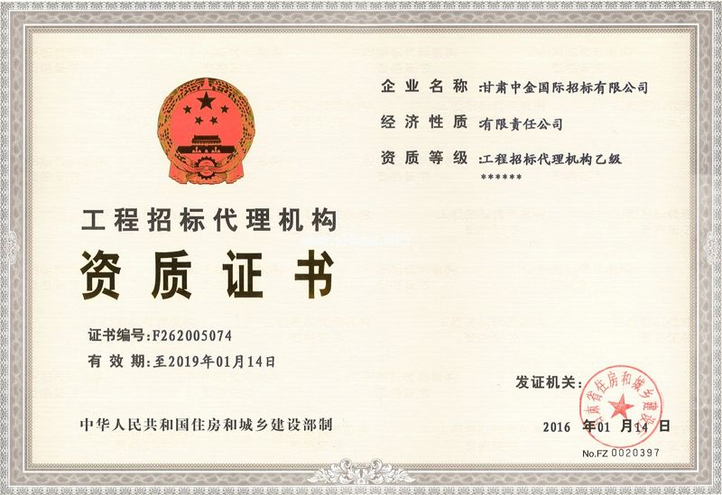 甘肅中金國際招標有限公司成立于2011年11月,注冊資金500萬元,于2012年5月取得由省財政廳頒發的政府采購代理機構乙級資質(政采代【乙】字第甘022號),并于2013年12月取得由中華人民共和國財政部頒發的政府采購代理機構甲級資質(政采代【甲】字第1121號),在2016年1月取得由甘肅省住房和城鄉建設廳頒發的工程招標代理機構乙級資質(F262005074);2015年4月取得機電產品國際招標代理資質,僅在短短幾年內成為本行業發展速度最快的公司之一。 甘肅中金國際招標有限公司由海外留學回國學生擔任核心領導,公司下設商務部、工程部、財務部及辦公室等業務部門,目前公司在職員工50余人,其中本科以上學歷占50%以上,擁有中高級國家技術職稱人員為19人。公司地處蘭州市繁華地段,交通非常便捷;辦公環境優良,擁有寬敞明亮的開標大廳、評標會議室和會客室;計算機網絡管理辦公系統,實現了全方位的辦公自動化;同時,公司擁有一支具有豐富招標經驗的專業團隊,憑借過硬的專業知識、積極主動的服務意識、科學嚴謹的工作作風服務于省內各行政機關、企事業單位,在招標服務過程中,我們兢兢業業,踏實工作,嚴格遵守國家規定和程序進行相關招標服務,受到了眾多業主及投標人的一致好評。 中金公司將以高效率、高質量及好服務為各業主單位和投標人提供優質和專業的招標服務。